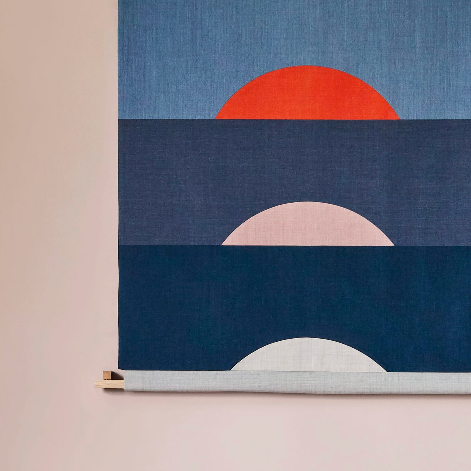 Kibun is Japanese for mood – and the name of the latest passion project by the Danish illustration and artist duo Hvass&Hannibal. Exploring how simple a story can be told, the result is a limited edition of textile panels that each expresses a scenery we know from nature: The slow setting of the sun, pouring rain, or tide coming in.